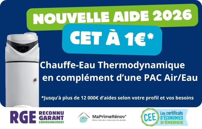 Inspiré des solutions modernes, le chauffe-eau thermodynamique, aussi appelé ballon thermodynamique, est un cumulus « classique » doté d’une pompe à chaleur au lieu et place d’une résistance thermique, de ce fait le CET utilise l’énergie électrique mais également les calories de l’air et permet de réaliser jusqu’à 60 % d’économies en comparaison à un système de chauffe-eau classique.